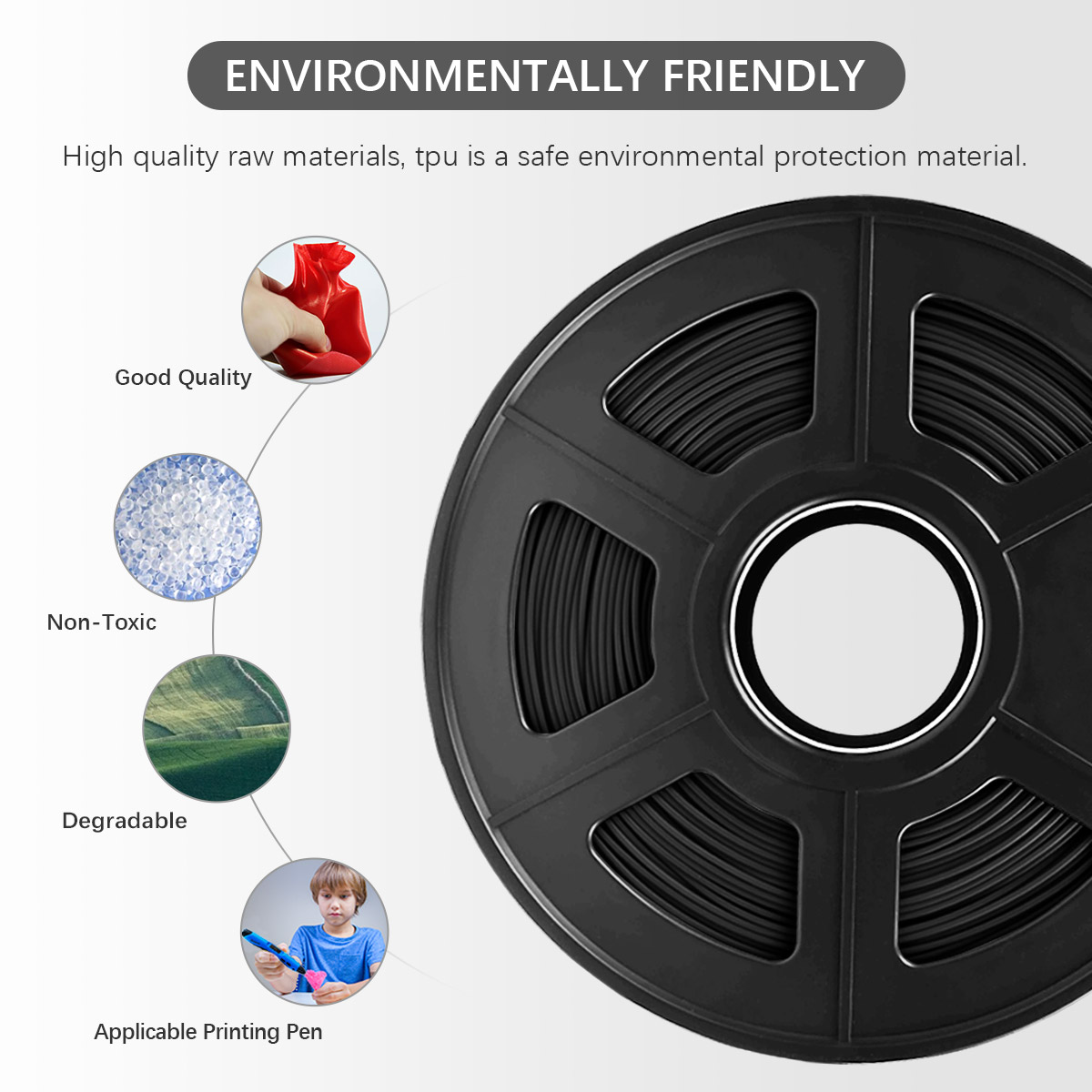 Conformes à la directive RoHS, nos filaments TPU de 1,75 mm sont exempts de substances potentiellement dangereuses, émettant une douce odeur. Considérés comme une amélioration par rapport au PLA Plusstic chaud, ils offrent une solution écologique pour vos projets d’impression 3D.