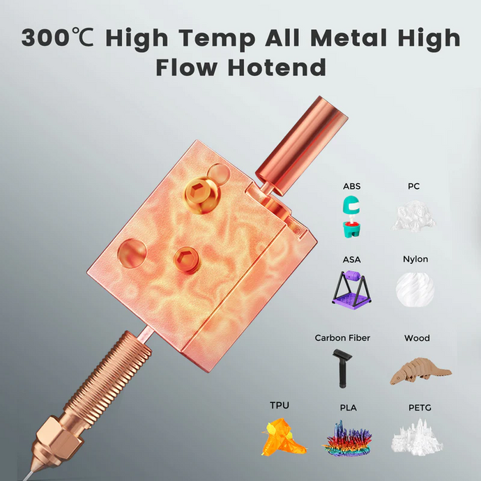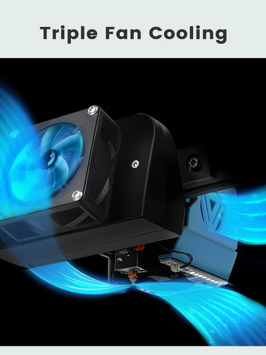 All-metal hotend comes with a larger melt zone, which offers a high flow of up to 20-30mm³/s that greatly reduces the possibility of clogging. An extra large fan at the rear of the extruder offers triple airflows to quickly cool prints and ensures good layering for better results. It makes the high speed and high temperature possible at the same time. No more PTFE replacements or firmware flashes are needed to print with different materials easily, like ABS, Nylon.